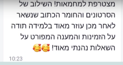 אנחנו איתך בקבוצת הווטסאפ לכל שאלה שתצטרך, וכל החומרים והתרגולים מחכים לך.